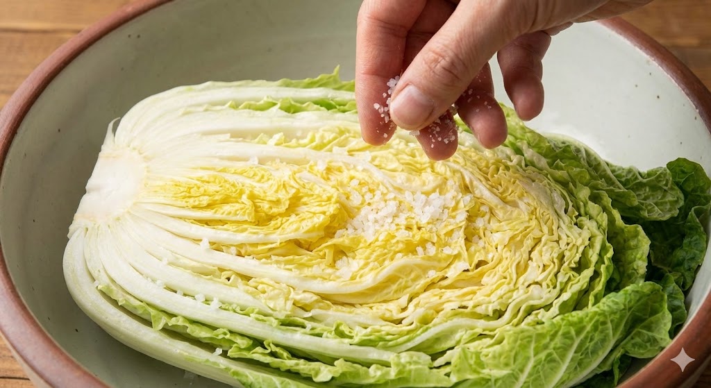 - 배추를 반으로 갈라 굵은소금을 줄기 부분에 골고루 뿌립니다.