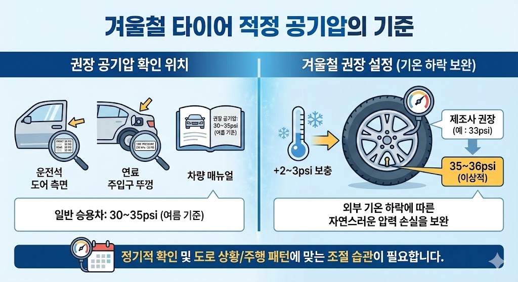 차량 제조사에서는 보통 운전석 도어 측면, 연료 주입구 뚜껑, 또는 차량 매뉴얼에 권장 공기압(psi 또는 kPa)을 명시하고 있습니다. 일반 승용차의 경우 30~35psi 사이가 보통이며, 이는 여름 기준입니다.