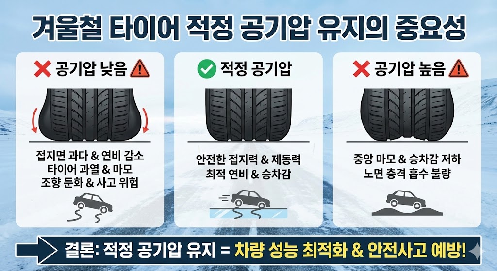 겨울철 타이어 적정 공기압을 정기적으로 확인하고, 도로 상황이나 주행 패턴에 맞게 조절하는 습관이 필요합니다.