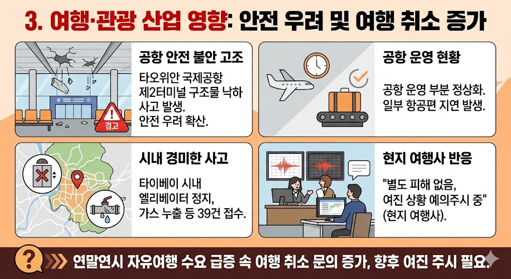 | 여행/관광 | 공항 일부 피해, 타이베이 경미한 사고 발생. 여행객 불안 확산 |