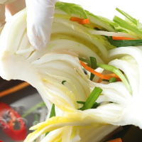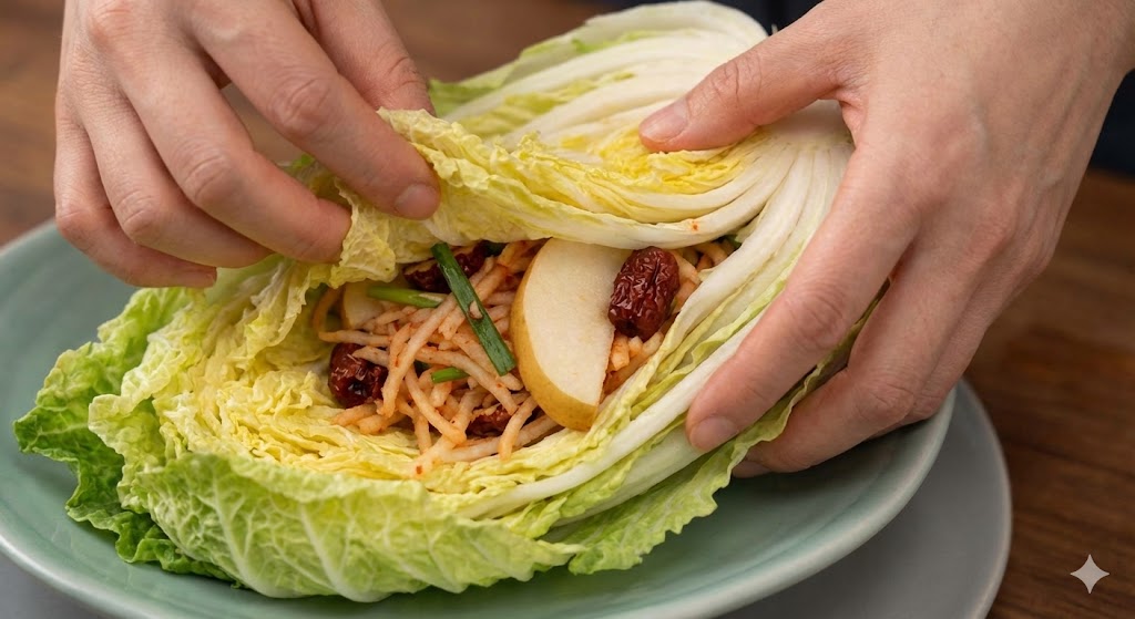 - 절인 배추 잎 사이에 무채, 쪽파, 배 조각 등을 넣어 속을 채웁니다.