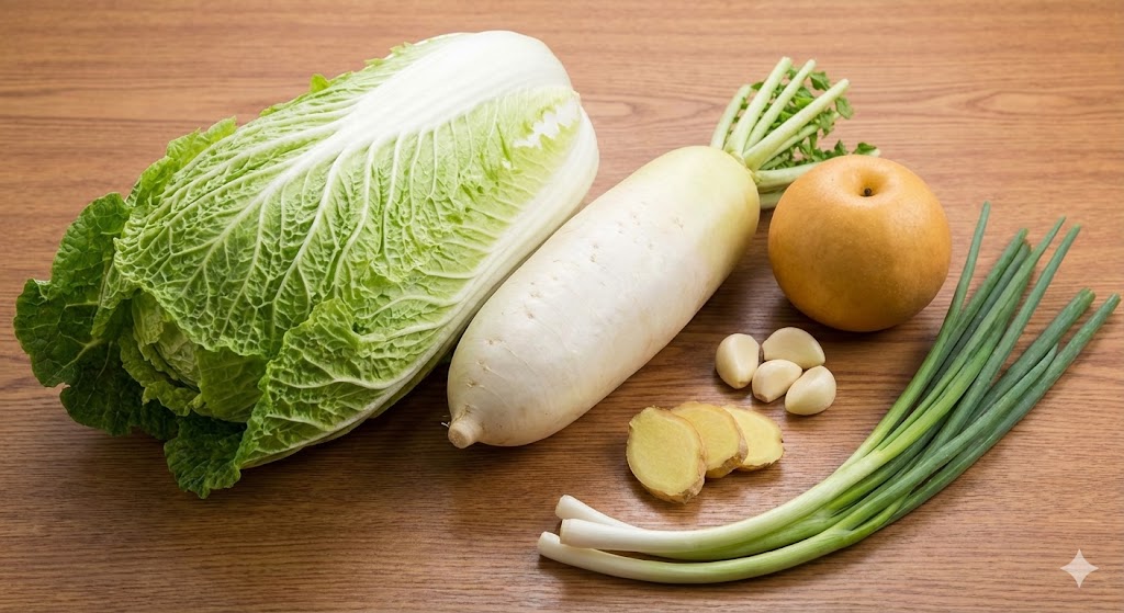 좋은 백김치는 신선한 재료에서 시작됩니다. 배추는 속이 노랗고 단단한 것을 고르고, 무, 배, 대파, 마늘, 생강 등을 준비합니다. 특히 백김치 쉽게 담그는법의 핵심은 재료의 신선도와 자연스러운 단맛을 내는 배·사과 같은 과일을 활용하는 것입니다.