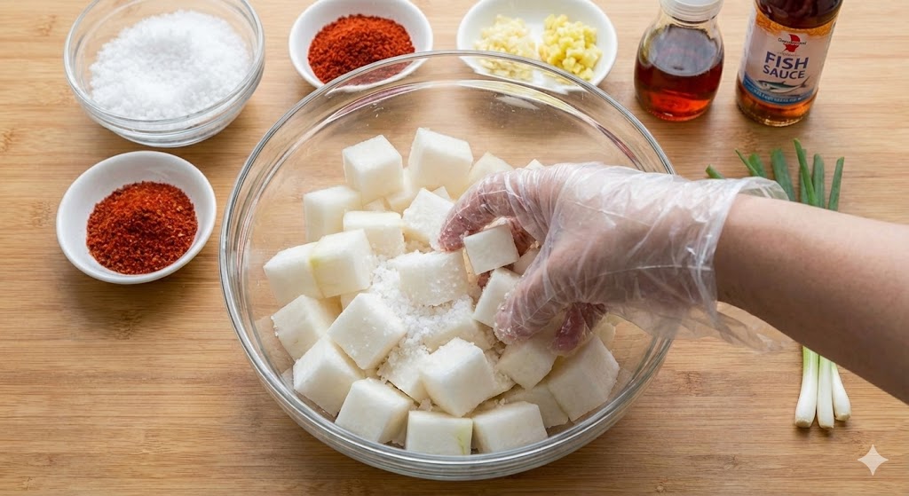 가장 핵심은 절이는 과정과 양념 비율입니다. 무를 30~40분간 절여 수분을 적당히 빼고, 씻지 않은 채 양념과 버무려야 맛이 잘 스며듭니다. 이 순서가 깔끔한 석박지 깍두기 담그는법의 핵심입니다.
