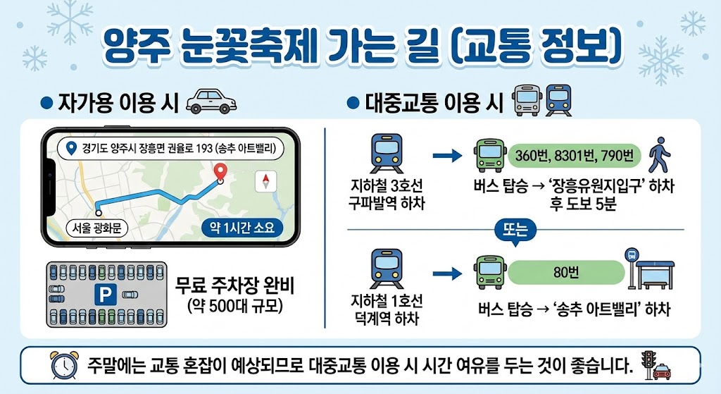양주 눈꽃축제는 서울에서 대중교통과 자가용 모두 접근이 용이합니다.